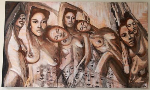 All of her is an interesting and complex work of art. The use of watercolor on gesso and wax finish on canvas creates a unique interplay of light and black, with the silver and pink hues appearing and disappearing depending on the angle of view. The abstract faces looking up to all of her add another layer of interpretation to the painting. The interplay between the figurative elements (naked woman) and the abstract elements (faces) could be seen as a commentary on the subjective nature of perception. figures looking at the painting adds another layer of intrigue, suggesting that the artwork is meant to be interacted with and interpreted by the viewer.
